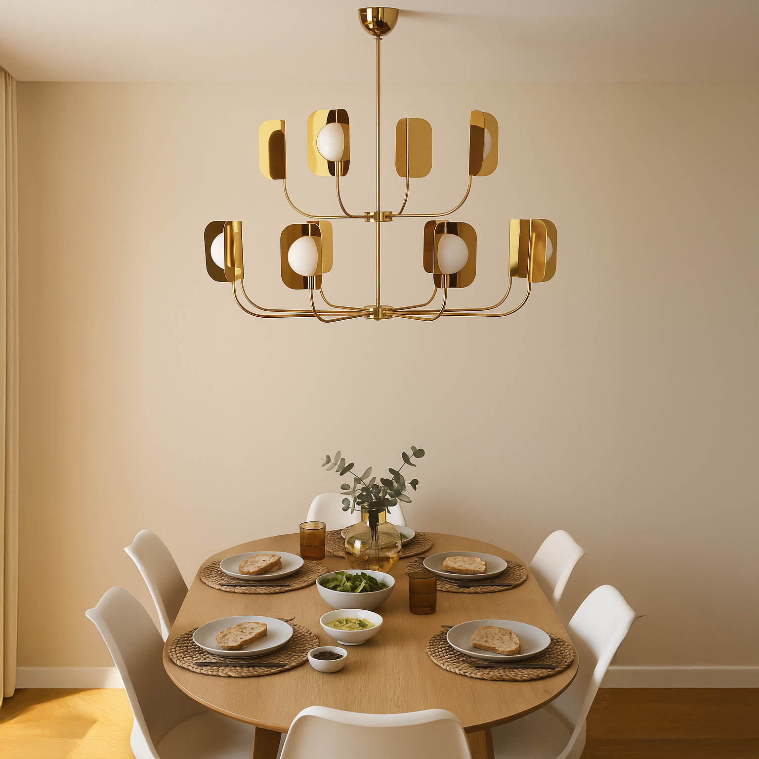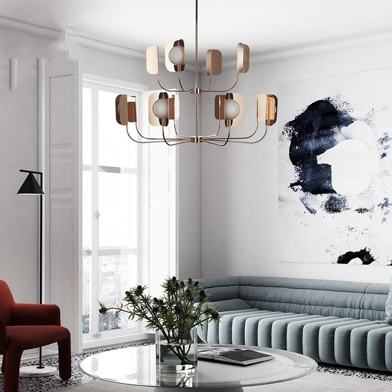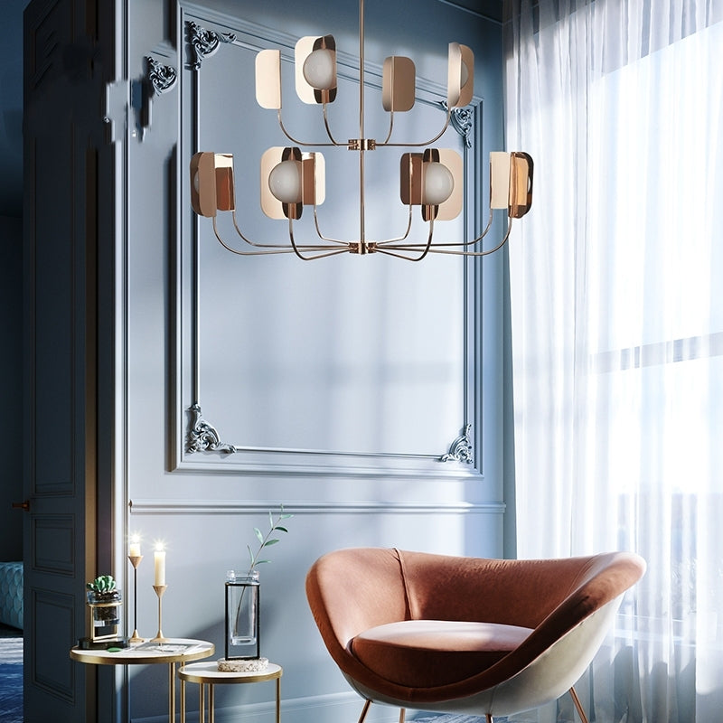 ثريا بتصميم واضح ومنظم، تتكوّن من هيكل معدني ناعم بلون ذهبي وردي، بأذرع ممتدة ينتهي كل منها بكرة زجاجية محاطة بقطعتين معدنيتين مثنيتين بشكل متقابل. الألواح المحيطة تعكس الضوء وتحدده، وتخلق توازنًا بصريًا دون مبالغة في الحجم أو التعقيد. مناسبة للصالات، المداخل، وغرف المعيشة الواسعة.