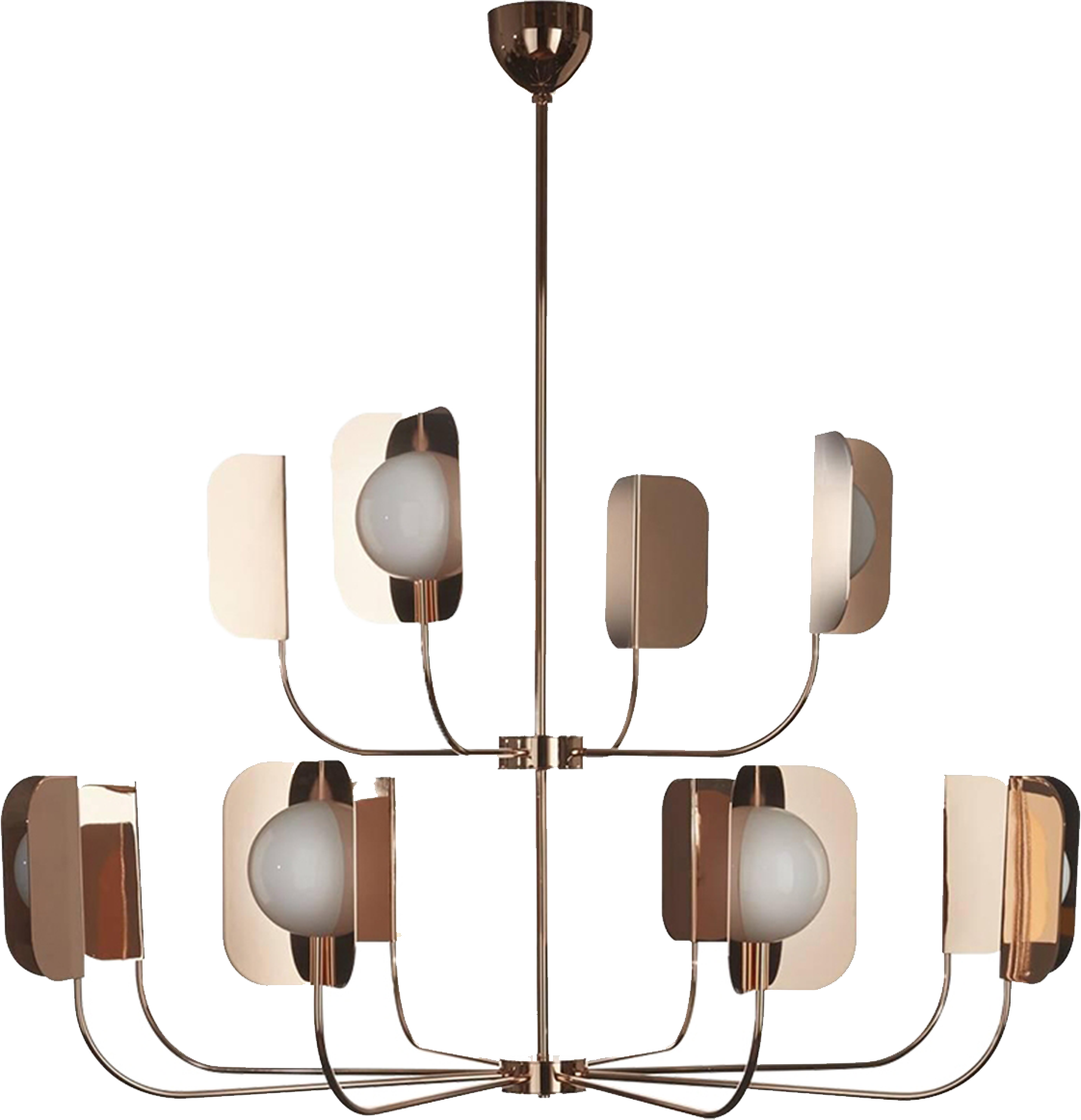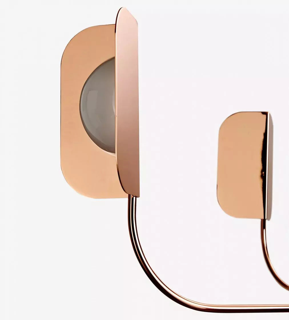 Metal chandelier with a symmetrical layout featuring spherical glass bulbs enclosed between two bent metal panels on each arm. The structure is finished in a rose gold tone and offers a soft yet directional light presence. Designed for open interiors such as living areas, entrances, and formal lounges.