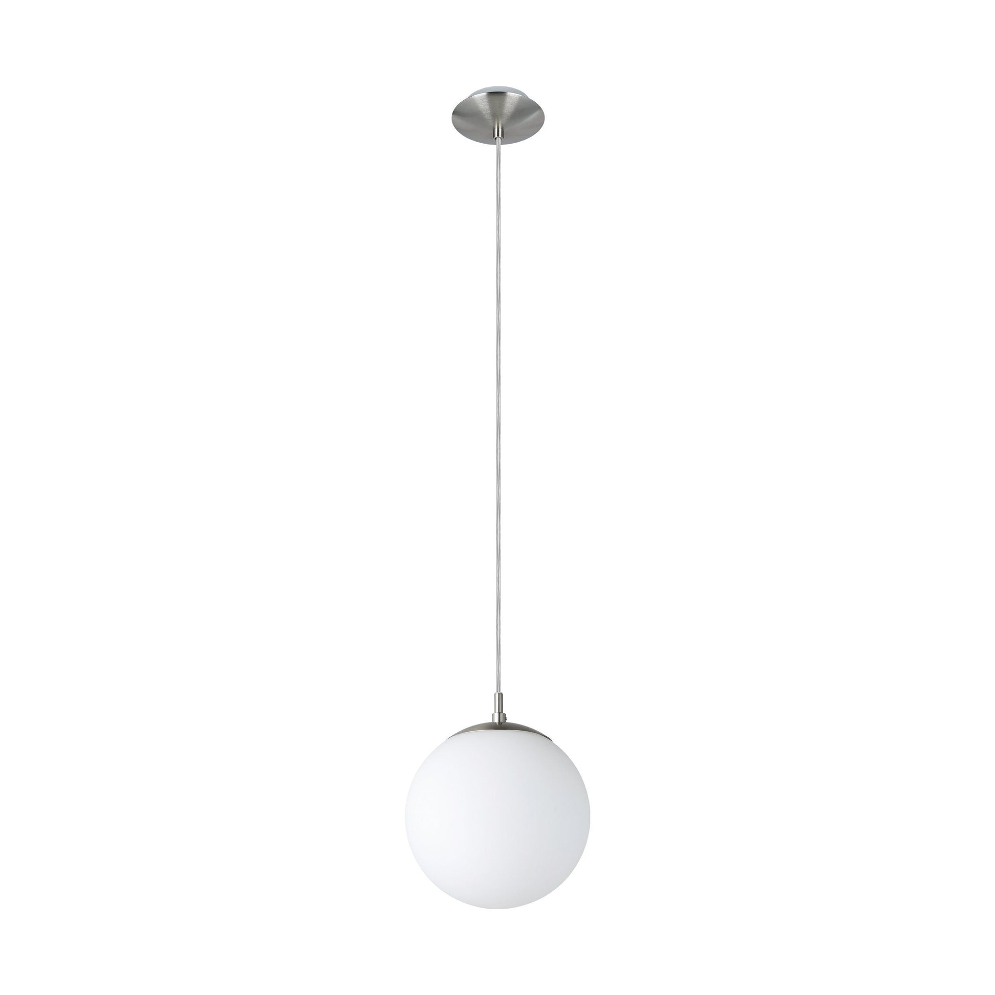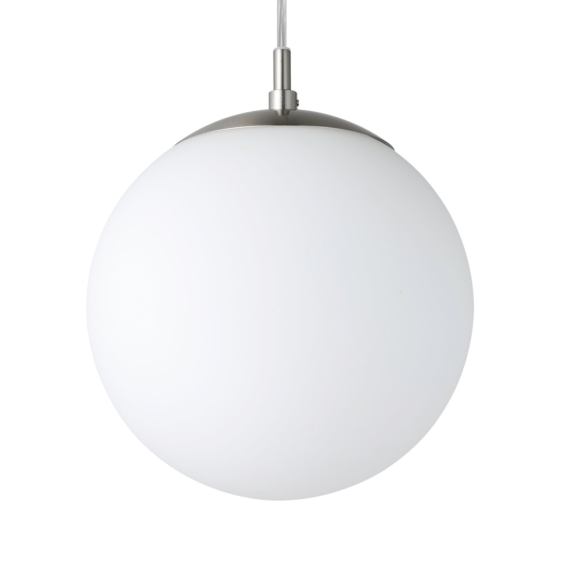 Minimal pendant light featuring a satin-nickel steel body with a matte opal-glass shade in white. Designed for indoor use and supports an E27 bulb up to 60W (not included), providing soft and balanced illumination.