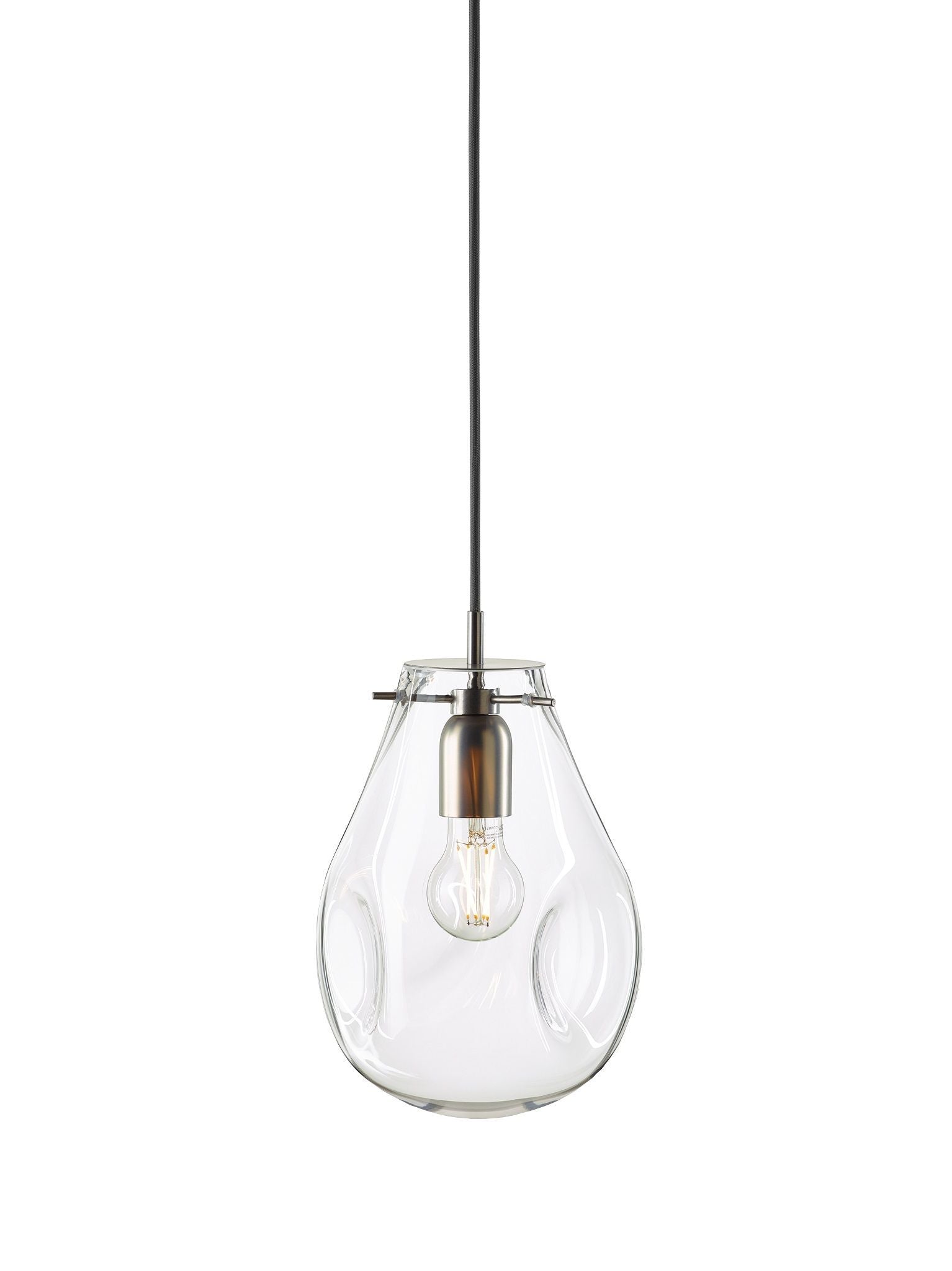 Pendant lamp made of hand-blown glass and metal holder, featuring an E27 socket for a single light source. The soft oval shape and clear glossy finish make it suitable for kitchens, entryways, and dining areas.